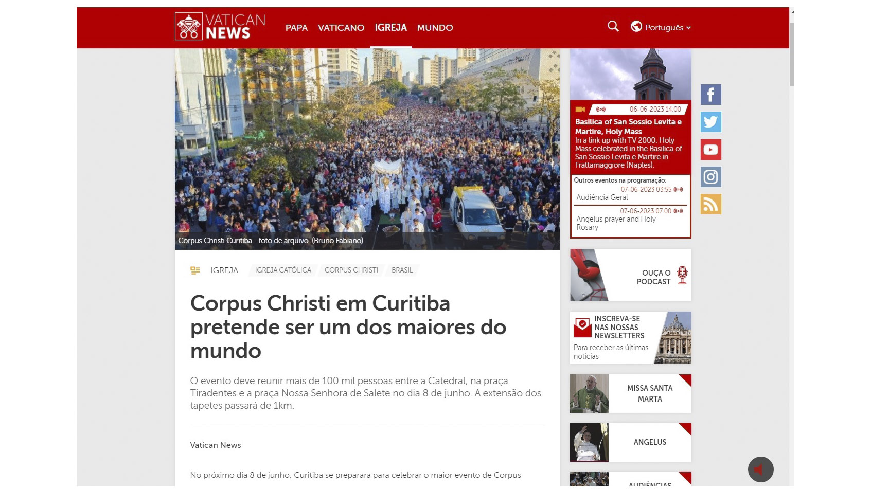 Curitiba está perto da maior celebração de Corpus Christi de todos os tempos, nesta quinta-feira (8/6), e a programação entre a Catedral e o Centro Cívico é destaque do portal Vaticano News, publicação on-line diária da Santa Sé em mais de 30 idiomas.