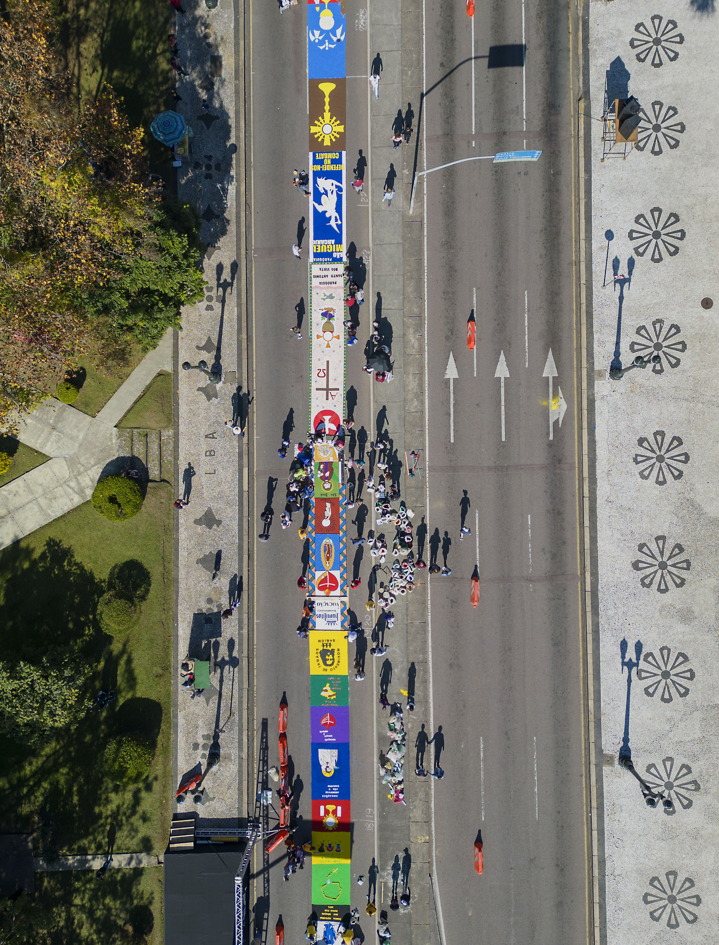 “Criamos os desenhos há mais de um mês. Fizemos moldes em TNT para, hoje, reproduzir no pavimento. Usamos barbante para delimitar a área para cada cor. Foram horas de joelhos, abaixados, mas vale muito a pena compartilhar esse gesto de profissão de fé e de fraternidade”, contou Tamara.