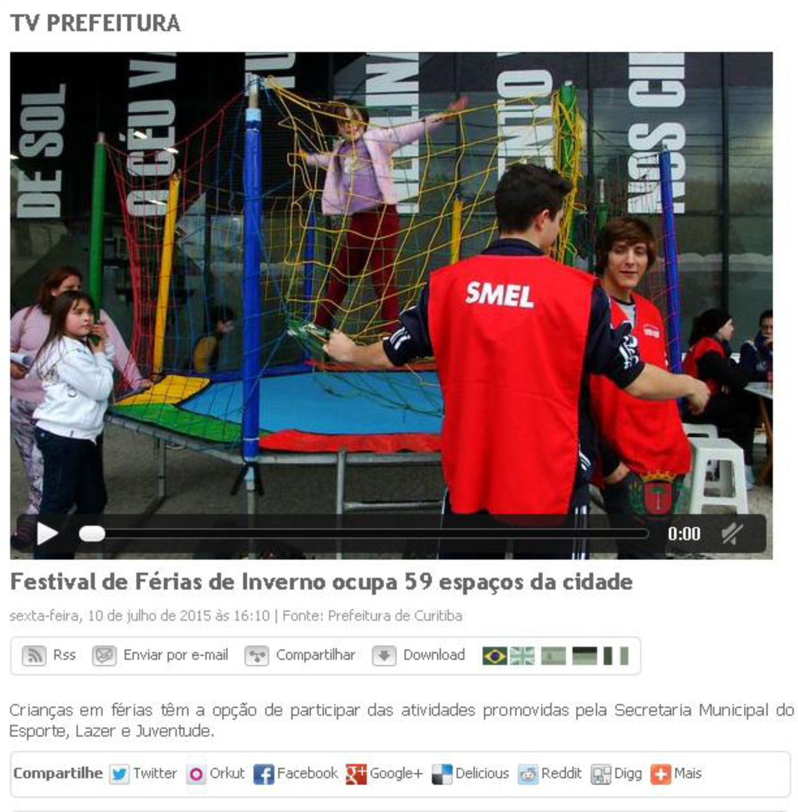 Aproximadamente 12 mil crianças, na faixa entre 6 e 12 anos, devem participar, a partir desta segunda-feira (6), do Festival de Férias de Inverno, promovido pela Secretaria Municipal do Esporte, Lazer e Juventude em 59 locais de toda a cidade. Serão duas semanas, de 6 a 10 e de 13 a 17 de julho, sempre no período da tarde, com atividades esportivas, recreativas, oficinas de artes, brinquedos infláveis, muros de escalada e oficinas de skate.